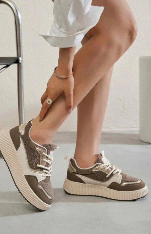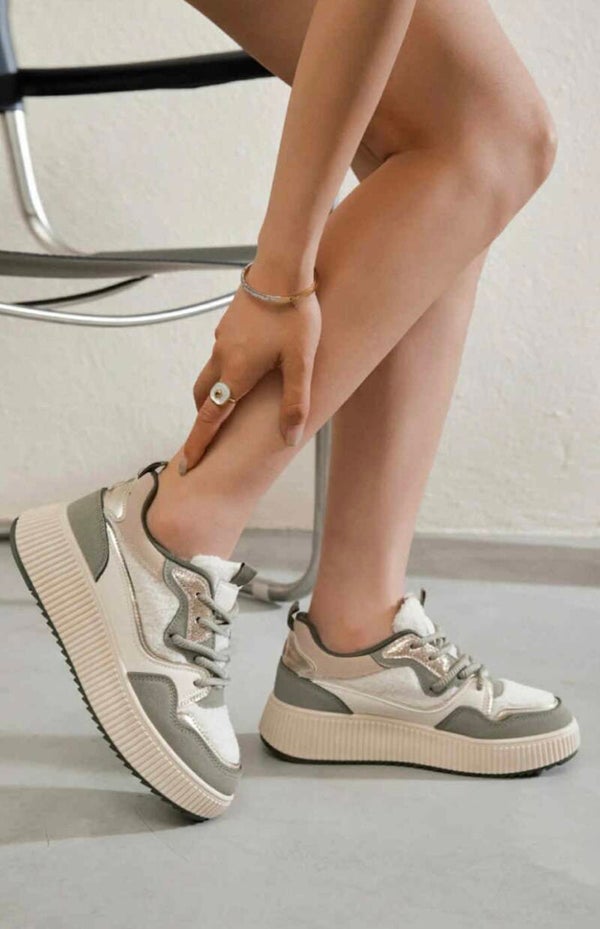 Ajoutez une touche tendance à vos tenues avec ces baskets à plateforme alliant confort et style. Confectionnées en tissu doux effet bouclette et détails en similicuir, elles se distinguent par leurs finitions métallisées et leurs associations de couleurs harmonieuses. Leur semelle épaisse crantée assure un excellent confort de marche tout en apportant une silhouette élancée.