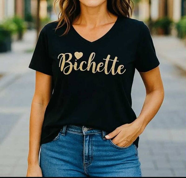 Adoptez un look à la fois féminin et tendance avec ce T-shirt col en V, disponible en noir ou brun. Sa coupe flatteuse met en valeur la silhouette, tandis que l’inscription “Bichette” en lettres dorées apporte une touche chic et pétillante. Facile à porter au quotidien, il se marie aussi bien avec un jean décontracté qu’une jupe élégante.