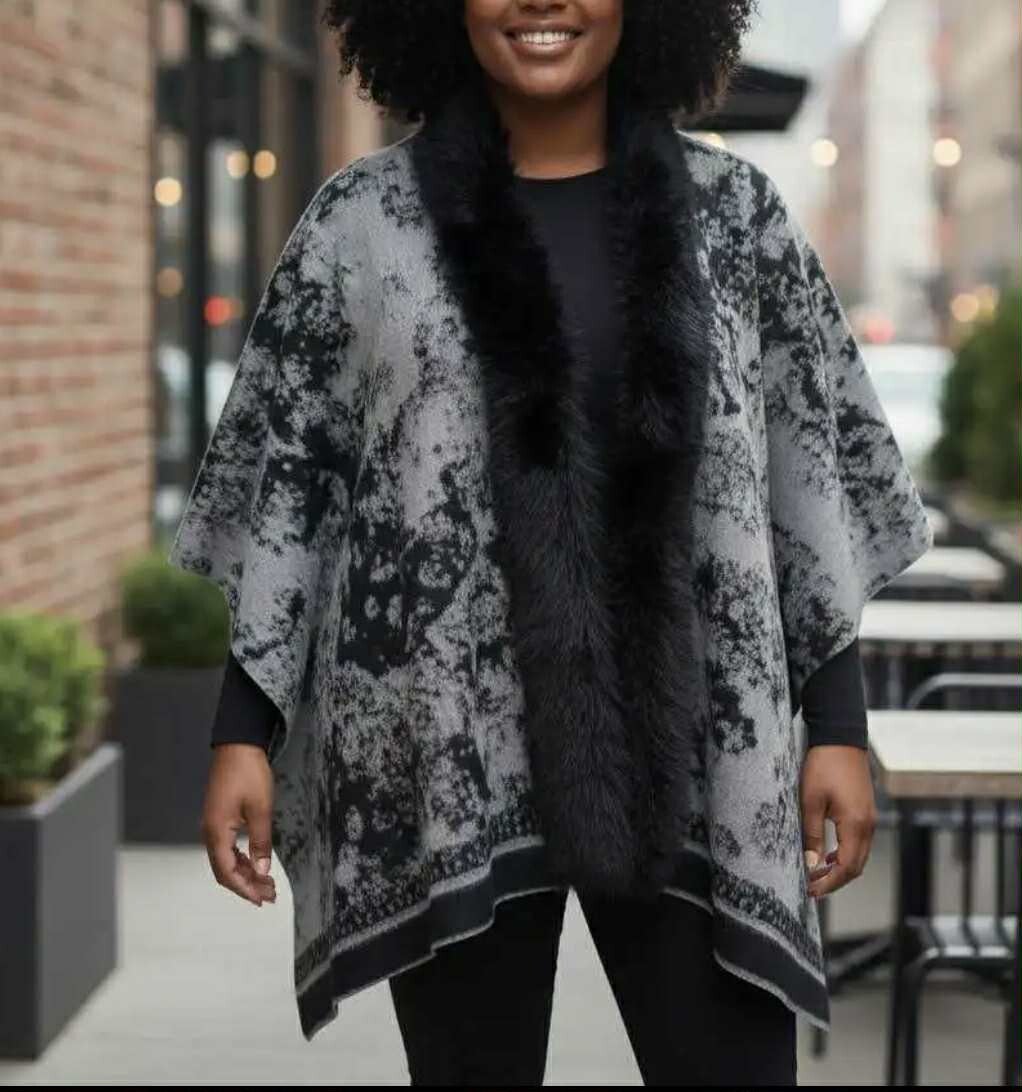 Affirmez votre style avec cette cape élégante, déclinée dans un imprimé noir et blanc moderne et ornementée d’un col effet fausse fourrure noire ultra doux. Sa coupe ample convient parfaitement de la taille 44 à la taille 58, en offrant chaleur et confort dans toutes vos tenues d’automne-hiver.