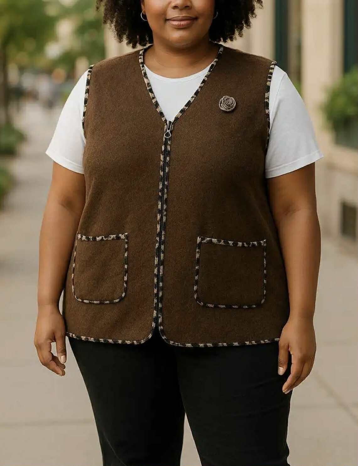 Apportez une touche de chaleur et d’originalité à vos tenues d’automne-hiver avec ce gilet sans manches grandes tailles proposé en plusieurs couleurs élégantes. Facile à porter ouvert ou fermé, il s’adapte parfaitement du 46 au 52, et même jusqu’au 54 porté ouvert, pour garantir un confort optimal au quotidien.
