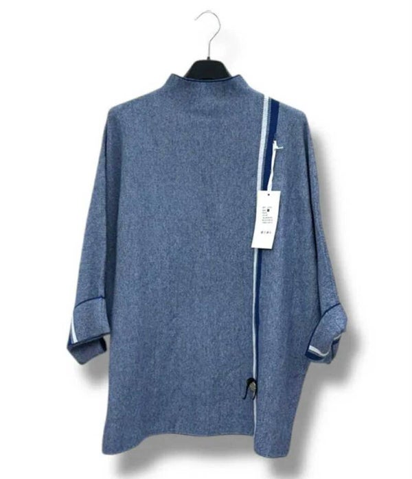 Restez élégante et confortable avec ce haut col montant, disponible en deux coloris : bleu jean et gris chiné. Sa coupe ample conviendra parfaitement aux tailles 44, 46, 48 et 50. Un joli détail de bande contrastante sur le devant et les manches ajoute une touche moderne et originale. Facile à porter au quotidien, il s’associe aussi bien avec un pantalon qu’une jupe.