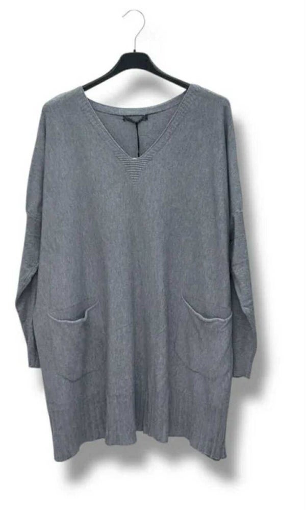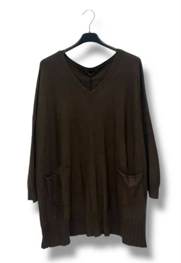 Pull ample grande taille, col V ou col rond selon modèle, manches longues, coupe fluide et confortable. Disponible en noir, taupe, gris, camel, marron foncé et kaki. Poches plaquées à l’avant pratiques et design moderne. Taille unique adaptée du 46 au 52. Parfait pour un style casual, élégant et décontracté, facile à associer avec un jean ou un pantalon.