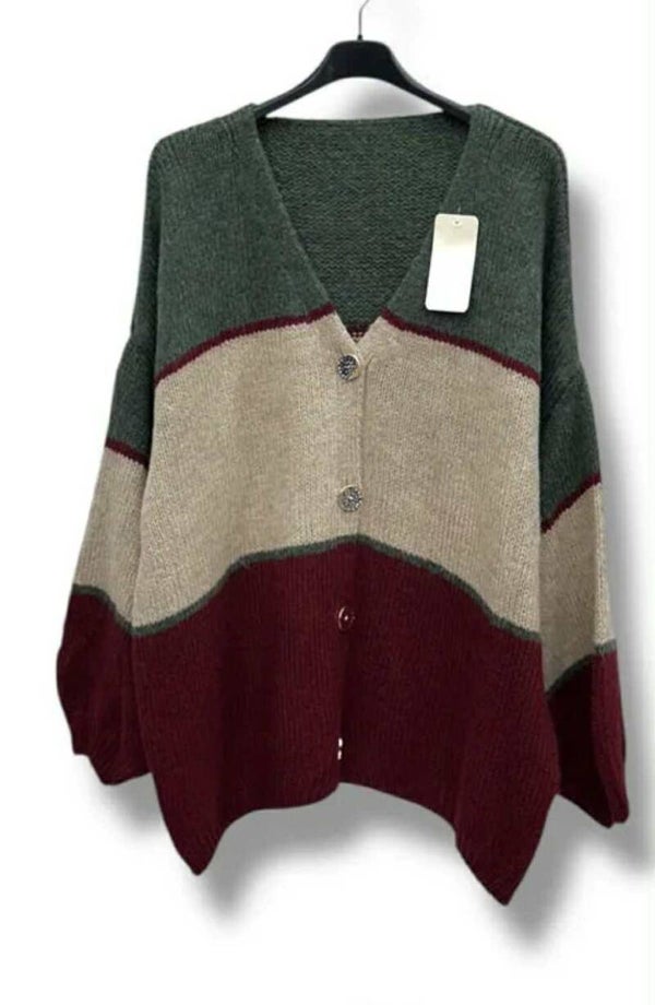 Gilet boutonné grande taille, coupe ample et confortable, parfait du 46 au 54. Motif color block avec larges bandes contrastées : décliné en version beige/gris/marron, ou vert/beige/bordeaux. Finition col en V et manches longues, parfait pour superposer sur vos tops et chemisiers. Matière douce et chaude pour un look casual chic, facile à porter au quotidien.